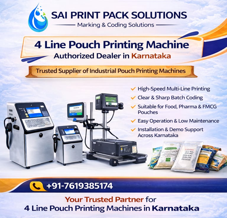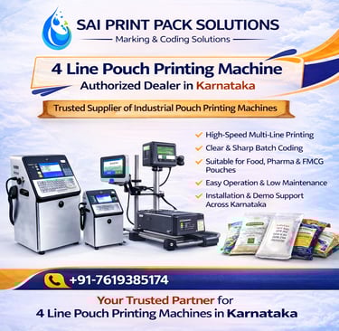 Sai Print Pack Solutions is a leading 4 Line Pouch Printing Machine dealer in Karnataka, offering advanced marking and coding systems for food, pharma, FMCG, and industrial packaging applications.
