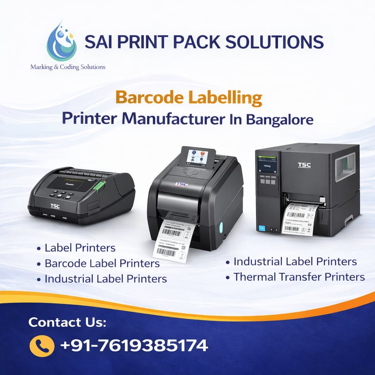 Sai Print Pack Solutions is a leading Barcode Labelling Printer Manufacturer in Bangalore, offering advanced marking and coding solutions for industries across Karnataka. We specialize in high-performance barcode label printers, industrial label printers, and thermal transfer printers designed to meet the growing needs of manufacturing, logistics, retail, pharmaceutical, and warehouse sectors.