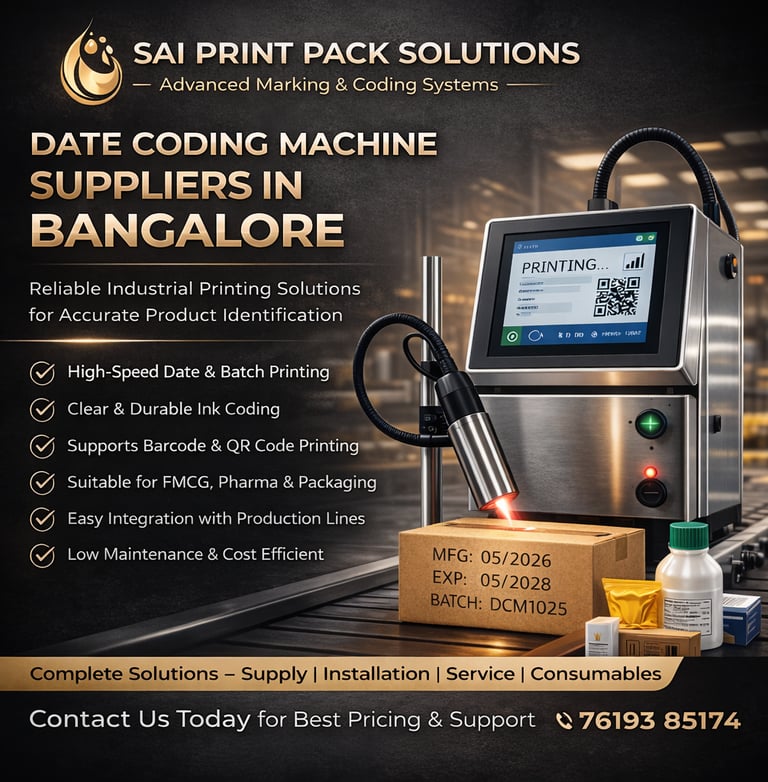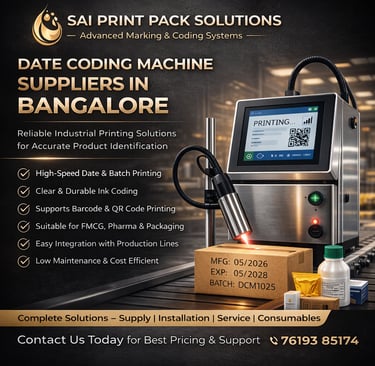 If you are looking for reliable date coding machine suppliers in Bangalore, Sai Print Pack Solutions is your go-to partner. We provide high-quality machines, expert guidance, and complete support to help your business achieve efficient and accurate product coding.
