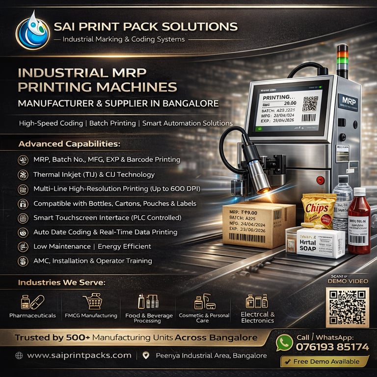 Contact Sai Print Pack Solutions today to explore the latest MRP printing machines, batch coding printers, and industrial inkjet solutions in Bangalore. Get expert guidance, live demonstrations, and the best pricing for your requirements.