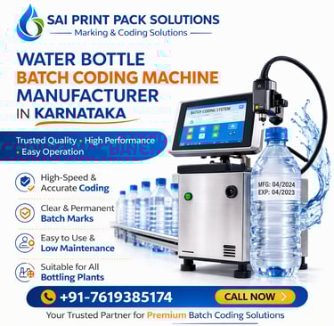 If you are searching for a dependable Water Bottle Batch Coding Machine Manufacturer in Karnataka, Sai Print Pack Solutions offers the ideal solution for modern packaging industries. Contact our team today to learn more about our advanced marking and coding machines designed for water bottling plants and industrial packaging applications.
